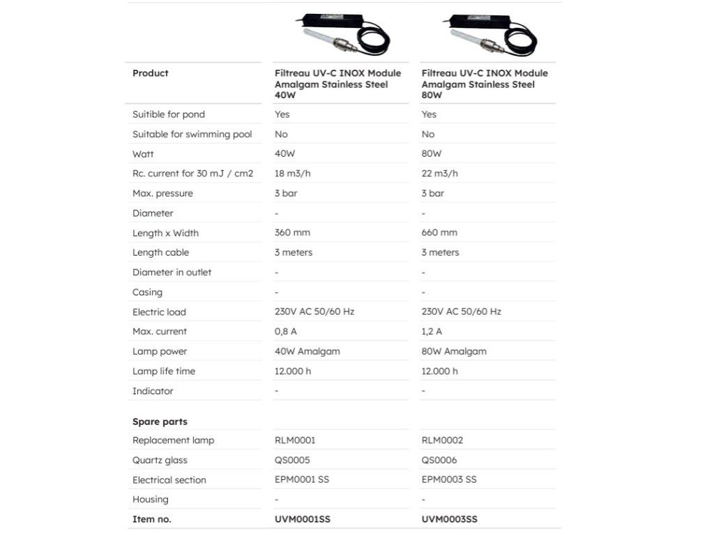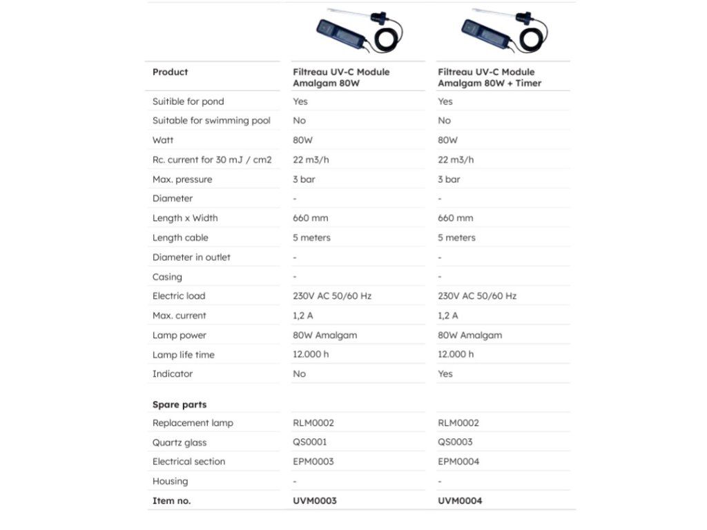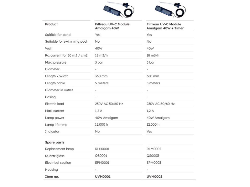 Lampy jsou dostupné v různých výkonových variantách a jsou plně kompatibilní s odpovídajícími UV-C moduly Filtreau.